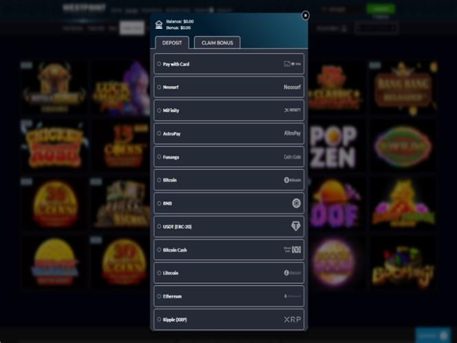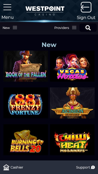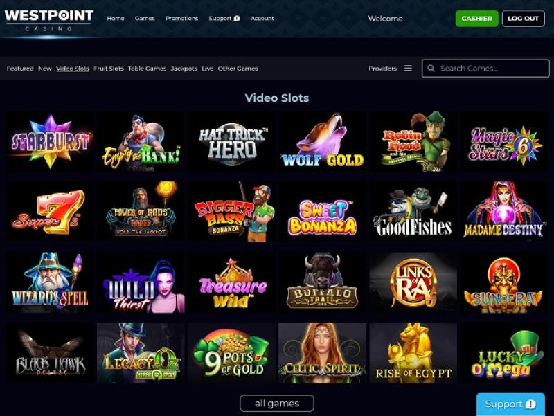 Westpoint 為會員提供各式各樣的賭場遊戲。賭場類別包括特色遊戲、新遊戲、視訊老虎機、水果老虎機、桌上遊戲、累積獎金遊戲、真人遊戲和其他遊戲,其中其他類別提供賓果遊戲、刮刮卡等遊戲…
