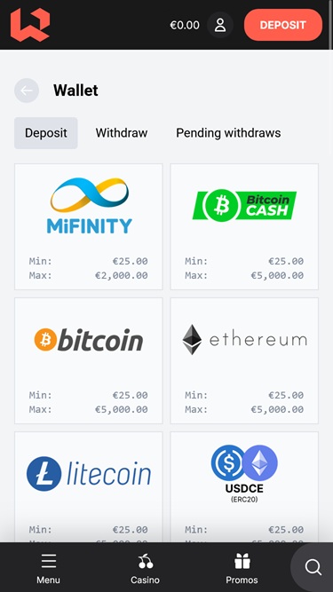 您可以透過多種銀行方式存取款至您的賭場帳戶,包括Visa、 Mastercard 、銀行電匯、Apple Pay、Google Pay、 MiFinity 、 Neosurf 、 Revolut和Flexepin等。此外,該網站還接受多種加密貨幣,包括比特幣、比特幣現金、以太坊、萊特幣、美元幣和泰達幣。