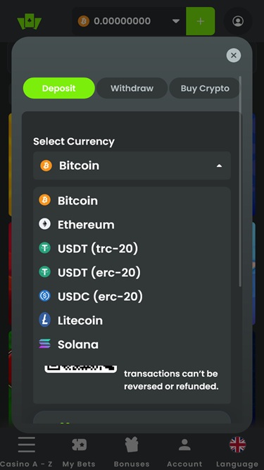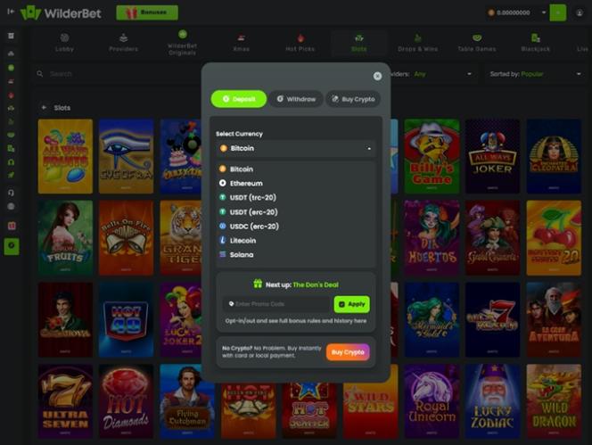 WilderBet Casino 主要是一個以加密貨幣為導向的博彩網站,接受多種加密貨幣進行存款和提款,包括比特幣、以太坊、萊特幣、索拉納、USD Coin 和泰達幣。玩家也可以使用Visa 、 Mastercard和銀行電匯等傳統支付方式直接在網站上購買資金。