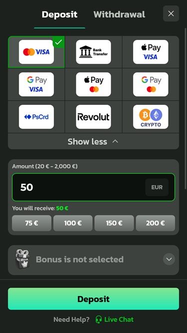 為了存取所有可用的博彩內容並充分享受賭場服務,您需要註冊一個新帳戶。為此,您可以輸入您的電子郵件地址並確認接受賭場的條款和條件,或者您可以使用現有的 Google 帳戶註冊。此步驟還包括輸入促銷代碼,以便使用某些可用的賭場獎金。