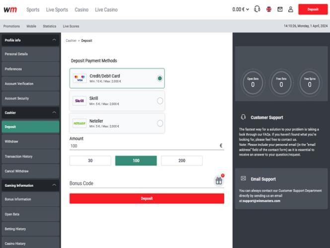 除了標準的賭場遊戲外,Winmasters Casino 還為玩家提供真人荷官、體育博彩和撲克服務。