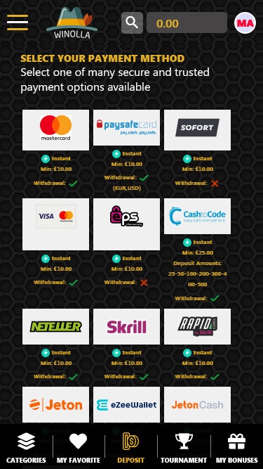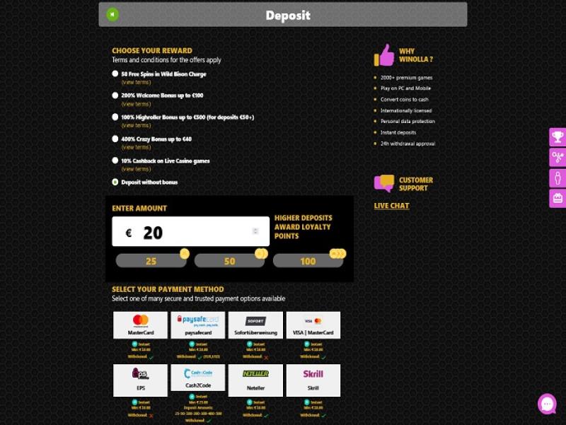 至於付款方式,Winolla Casino 為玩家提供使用知名選項進行存款的機會,例如 Visa、MasterCard、Paysafecard、Neteller、Trustly、Astropay 和Skrill等。