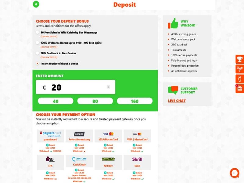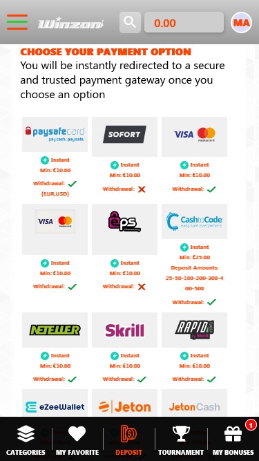 至於銀行選項,Winzon Casino 提供多種付款方式供您選擇。玩家可以從Visa、MasterCard、Neteller 和 Skrill 等熱門支付方式中進行選擇。此外,您還可以選擇使用加密貨幣支付,因為加密貨幣長期以來一直很受歡迎。