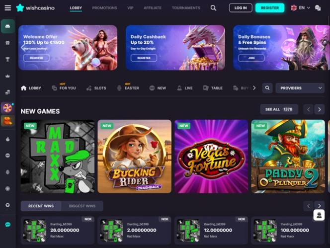 WishCasino 是一家線上賭場,由一家經驗豐富的公司經營和擁有,該公司根據庫拉索法律成立,並由庫拉索政府監管和許可。該網站面向來自加拿大、挪威、芬蘭、紐西蘭和愛爾蘭的玩家,並提供英語、德語、芬蘭語和西班牙語的在地化版本。