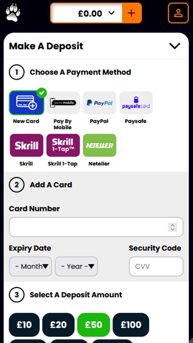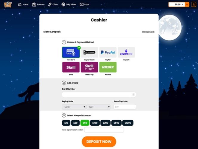 關於支付方式,Wolf Spins 賭場接受多種傳統支付方式,包括Visa 、 Mastercard 、 Maestro 、 Paypal 、 Paysafecard 、 Skrill和Neteller 。遺憾的是,在撰寫本文時,該品牌尚不接受加密貨幣。