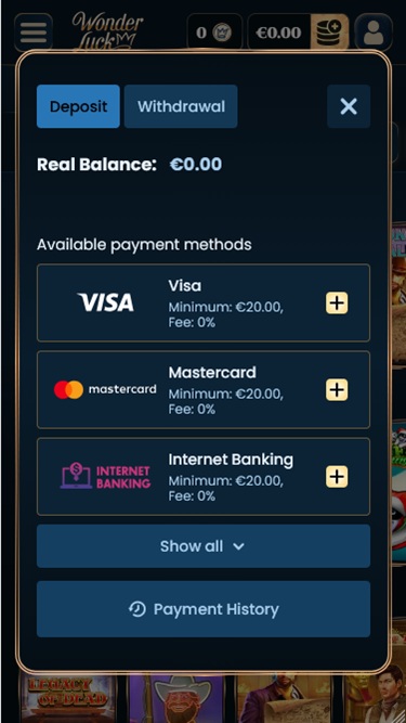 Banking銀⾏業務選項 的 WonderLuck Casino