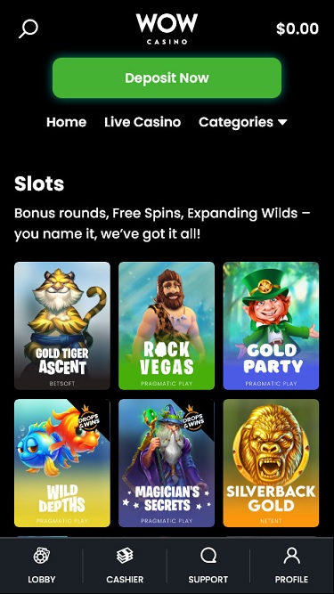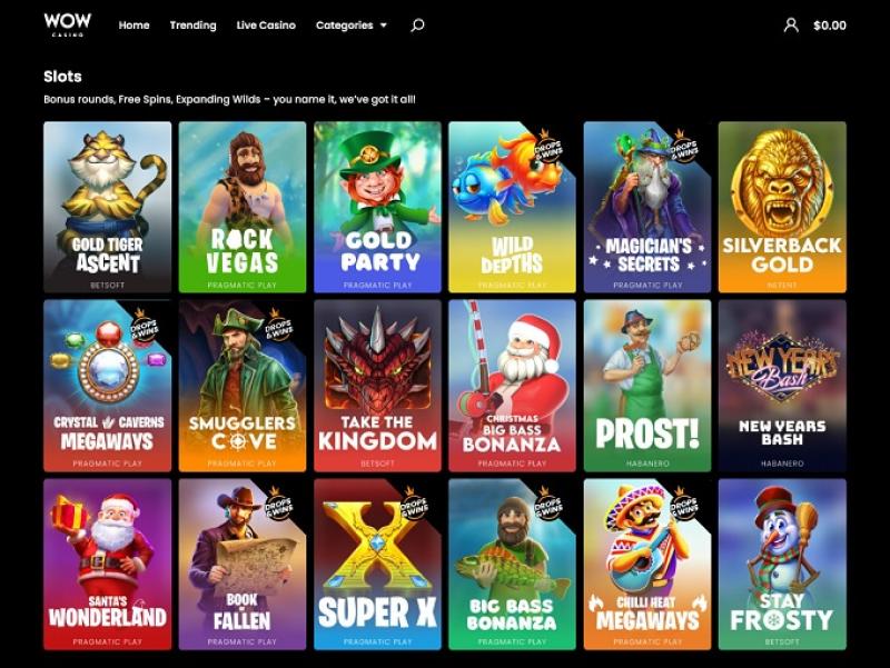 儘管 WOW 賭場提供的遊戲數量相當少,但我們需要指出的是,所有遊戲都經過精心挑選,並分為幾個遊戲類別:新遊戲、熱門遊戲、現場遊戲、老虎機、掉落和贏取遊戲、桌面遊戲和刮刮樂。