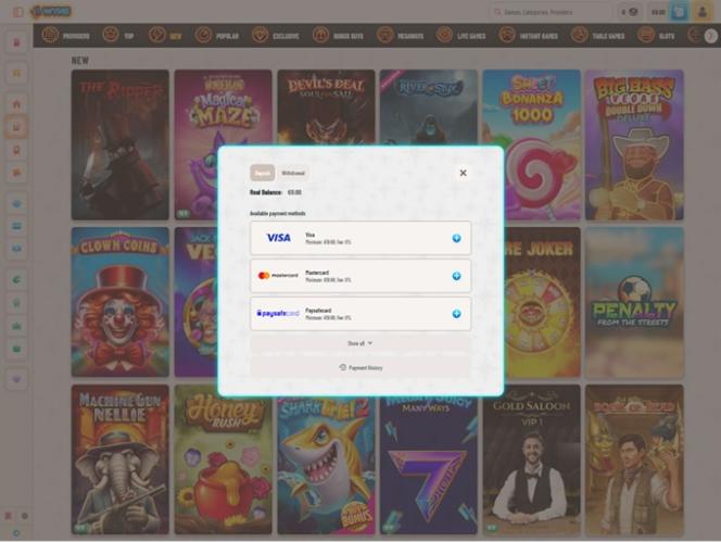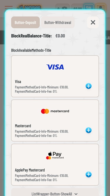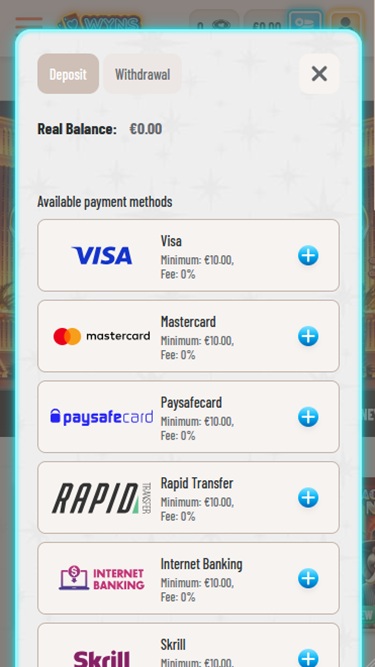 Wyns 賭場提供各種支付方式,例如 MiFinity、銀行電匯、Neosurf、Nordea、Skrill、Netteler、Visa 和 MasterCard 等等,以及許多加密貨幣選項,例如比特幣、比特幣現金、卡爾達諾、狗狗幣、以太坊、萊特幣、瑞波幣、Tether 和 USD Coin。