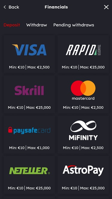 喜歡使用加密貨幣作為主要銀行業務方式的玩家可能會失望地發現,目前沒有這樣的選項。另一方面,如果您想使用Visa、Mastercard、Neteller、Skrill、Paysafecard、Neosurf、JetonCash 等熱門銀行卡進行提款和存款,您會很高興知道,他們將能夠毫無問題地進行這些操作。