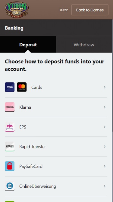 Yukon Gold Casino 由 Microgaming, Evolution Gaming, Rabcat, Triple Edge Studios, Northern Lights Gaming, Stormcraft Studios, Switch Studios, Electric Elephant Games, All41 Studios, Gameburger Studios, Pulse 8 Studios, Neon Valley Studios, SpinPlay Games, Real Dealer Studios, GONG Gaming, On Air Entertainment, Buck Stakes Entertainment, Games Global, Old Skool Studios, Foxium, Just For The Win, PearFiction Studios, Slingshot Studios, Fortune Factory Studios, Crazy Tooth Studio, Alchemy Gaming, Snowborn Games, Gold Coin Studios, Half Pixel Studios, Eurostar Studios and Aurum Signature Studios提供支持,允許玩家透過其龐大的平台存取數百款遊戲。您可以透過網頁平台或可下載的用戶端軟體造訪賭場,用戶端軟體將賭場和遊戲直接安裝在您的電腦上。這兩個平台之間沒有區別,玩家可以根據自己的喜好選擇。Baccarat