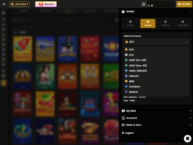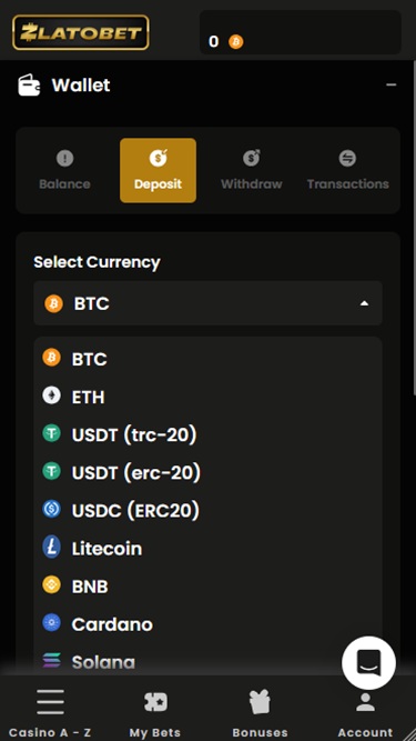 Zlatobet Casino 採用現代化的支付方式,因為這個賭博品牌主要致力於為玩家提供多種存款和提款的加密貨幣選項,包括比特幣、卡爾達諾、以太坊、萊特幣、 Solana 、 USD Coin和Tether 。