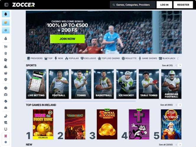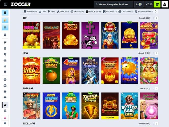 該賭場的遊戲庫提供數千款遊戲。因此,您會發現許多知名 iGaming 遊戲開發商的遊戲也就不足為奇了。以下是您將在 Zoccer 看到的一些開發商: Microgaming, Playtech, BetSoft, 1x2gaming, Amatic Industries, Habanero Systems, Novomatic, Oryx, playson, Quickspin, Thunderkick, Vivo Gaming, Yggdrasil, Endorphina, Wazdan, GameArt, Betgames, Booming Games, PlayPearls, Stakelogic, Pragmatic Play, Red Tiger Gaming, LuckyStreak, Spinomenal, Felix Gaming, Red Rake Gaming, Skillzzgaming, Fugaso, Fantasma Games, Kalamba, Revolver Gaming, Platipus Gaming, Skywind, Spinmatic, Spadegaming, Triple Edge Studios, BGAMING, Northern Lights Gaming, Fazi, Evoplay, Stormcraft Studios, SA Gaming, OneTouch, Bulletproof Games, All41 Studios, Gluck Games, Mascot Gaming, Gameburger Studios, Pulse 8 Studios, Slot Factory, Neon Valley Studios, Swintt, Mancala Gaming, Expanse Studios, HungryBear Gaming, SmartSoft Gaming, On Air Entertainment, Holle Games, Buck Stakes Entertainment, Caleta Gaming, Creedroomz, Games Global, Reevo, Amusnet Interactive, Wizard Games, Ash Gaming, CT Interactive, Greentube, Pariplay, Tom Horn Gaming, Gamomat, BF Games, Bally Wulff, Iron Dog Studio, Foxium, Zitro, Reflex Gaming, PearFiction Studios, Apollo Games, Wild Streak Gaming, Slingshot Studios, Golden Hero, Fortune Factory Studios, RubyPlay, 4ThePlayer, AvatarUX, Gamevy, Crazy Tooth Studio, NetGaming, SlotVision, Alchemy Gaming, Rarestone Gaming, Indi Slots, Vibra Gaming, Snowborn Games, Boomerang Studios, Hacksaw Gaming, Gold Coin Studios, Bang Bang Games, Gamzix, Arcadem, Slotmill, Peter And Sons, Aurum Signature Studios, Charismatic, Onlyplay, FastSpin, Gamebeat, ELA Games, Aviatrix, Kiron, TaDa Gaming, 3 Oaks Gaming, Amigo Gaming, Apparat Gaming, PopOK Gaming, Circular Arrow, Gaming Corps, HammerTime Games, BetSolutions, Nailed It! Games, Atomic Slot Lab, Neko Games, Oros Gaming, Givme Games, Imagine Live, Indigo Magic, Popiplay, Zillion Games, ICONIC21, Clawbuster, Galaxsys, VoltEnt, InOut Games, Turbo Games, Penguin King, Red Papaya and Riddec Games 。