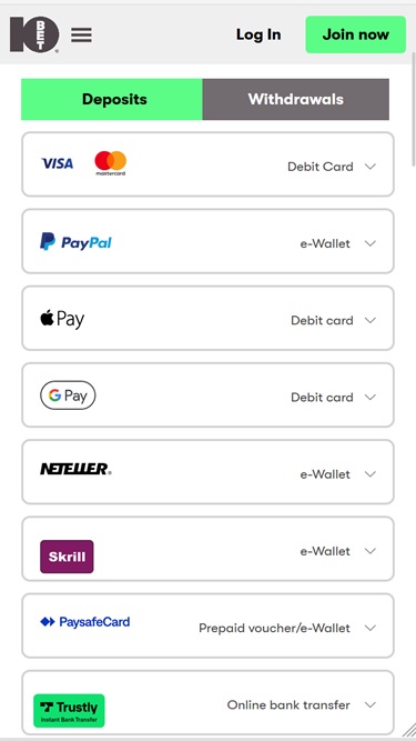 除了研究許可證之外,我們還建議您仔細考慮您感興趣的體育博彩網站提供哪些付款方式。 10bet 為其玩家提供多種存款和提款的銀行選項,包括信用卡、電子錢包、銀行轉帳、 預付卡和加密貨幣。