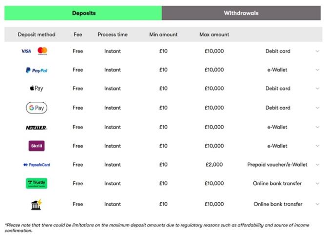 您可以使用的傳統支付方式有Apple Pay 、 BankID 、 CoDi 、 EPS 、 Euteller 、 Google Pay 、 Interac 、 Maestro 、 Visa 、 Mastercard 、 MuchBetter 、 Skrill 、 Neteller 、 Pay n Play 、 PayPalish 、 Paysafecard 、 Payz 、 Sofort Banking 、 Sofort Banking 、 Trustustly 。