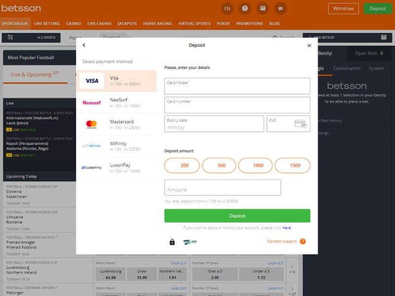 付款方式會根據您所在國家/地區的適用情況而有所不同。根據所選的銀行方式,最低存款金額為 10 歐元。 Betsson 不收取存款手續費。