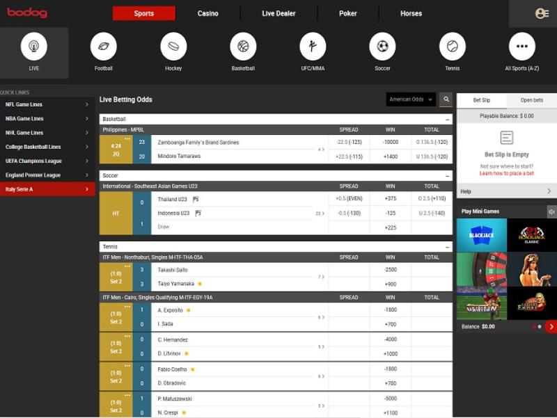 Bodog 提供種類繁多的運動博彩,每項體育賽事的投注選項也豐富多元。其涵蓋的運動項目包括:現場直播、美式足球、籃球、冰球、足球、UFC、綜合格鬥、網球、羽毛球、棒球、拳擊、板球、自行車、飛鏢、娛樂、電子競技、五人制足球、高爾夫、手球、賽馬、賽車運動、彩票遊戲、奧運會、其他體育、政治、橄欖球聯賽、橄欖球聯盟、斯諾克、冬季運動、乒乓球遊戲、冬季運動等等。