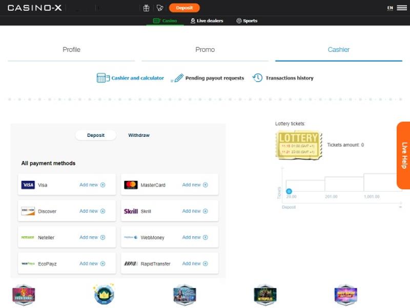 現代體育博彩吸引更多玩家最簡單的方法之一,就是提供豐富的存款和提款支付選項。 Casino-X 團隊深諳此道,因此玩家可以使用多種銀行選項來管理資金,包括信用卡、金融卡、電子錢包、預付卡、代金券、銀行轉賬,甚至現代加密貨幣。