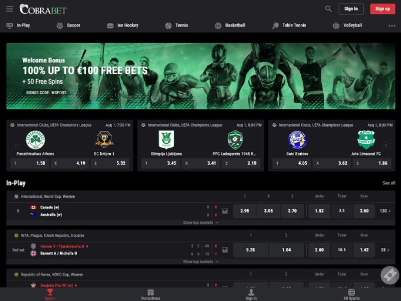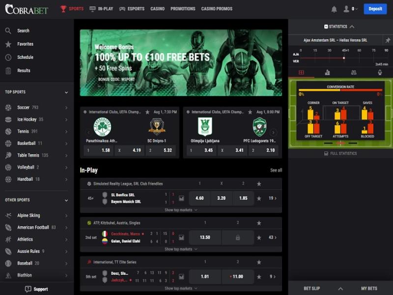 向下捲動,您將看到所有熱門和新遊戲的清單。點擊主頁上的「體育」按鈕,即可在新分頁中開啟「Cobra Bet」頁面。 Cobra Casino 體育博彩頁面簡潔明了,所有內容都井然有序,為忠實客戶提供了豐富的內容,並慷慨地提供了卓越的 VIP 計劃。即使是新手也會發現這個網站易於使用,不會過於激進或複雜。