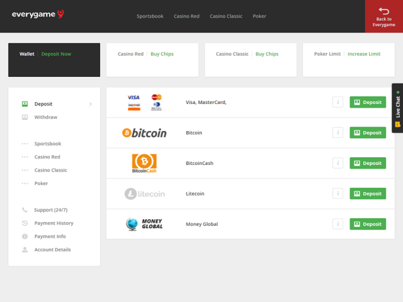 Every Game 體育博彩為客戶提供多種銀行業務選項,無論他們是存入還是提取帳戶中的貨幣。