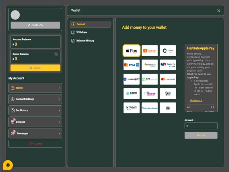 這家線上體育博彩和賭場的一大優勢是其高度全面的銀行業務選項。南非居民還可以前往當地的 Gbets 投注站為線上帳戶充值。