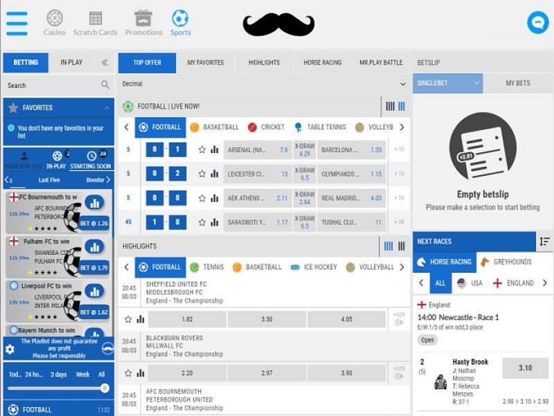這家全新且令人興奮的線上遊戲提供商、賭場和體育博彩公司致力於吸引全球體育博彩玩家。該品牌由Marketplay LTD擁有和經營,該公司受馬耳他法律和法規的管轄和監管。本網站上的博彩選項由Aspire Global International LTD提供支援和管理。 Mr. Play的體育博彩頁面簡潔明了,易於瀏覽,並配備了頂級體育博彩平台應有的所有功能。