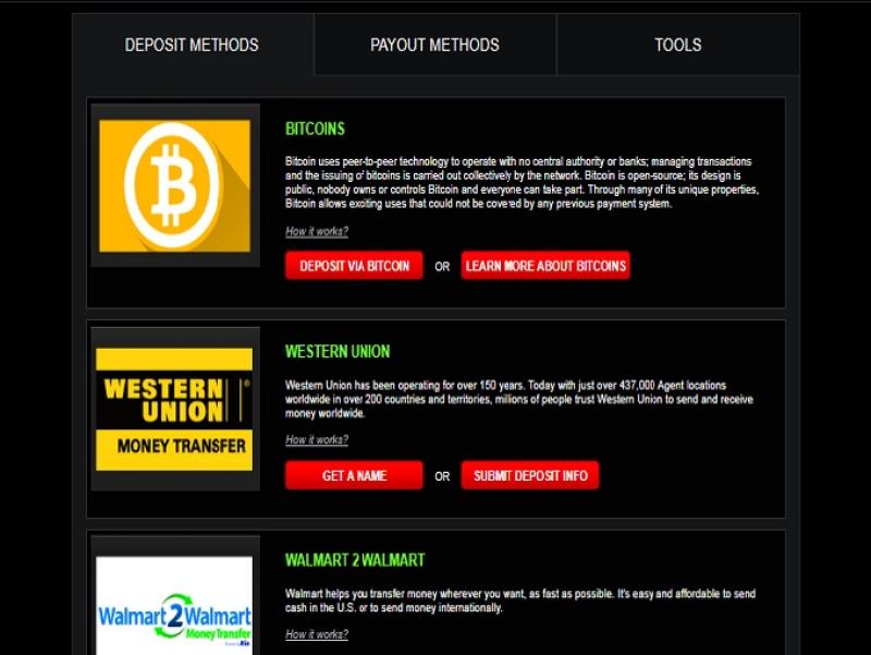 提款方式:Visa、萬事達卡、Discover、美國運通卡、比特幣、比特幣現金、以太坊、達世幣、卡爾達諾、預付禮品卡、沃爾瑪至沃爾瑪、西聯匯款、速匯金、銀行間轉帳、現金銀行存款、匯票、Pay Pal 至 Pay Pal、Zelle Pay、萊特幣、瑞幣恆星、新硬幣。