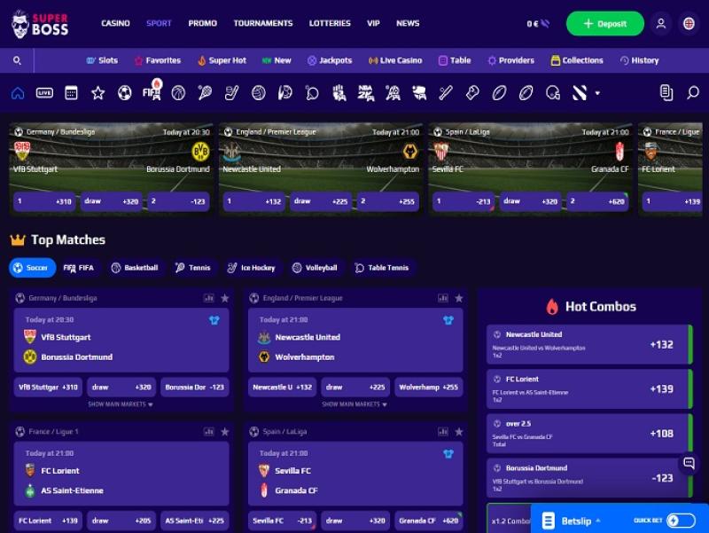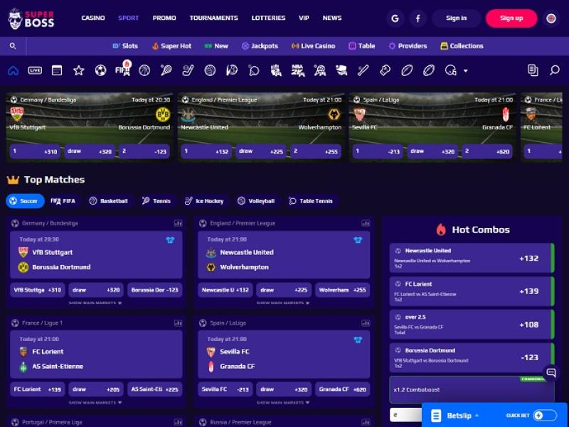Super Boss 體育博彩和線上賭場提供了絕佳的線上運動博彩體驗,或許可以作為現代博彩和投注網站呈現和運營的樣板。這個先進的線上平台的體育博彩部分一眼望去,即使是最資深的體育博彩玩家也會被其深深吸引。您會發現 Super Boss 體育博彩與其近期其他競爭對手之間存在巨大差異。網站的設計非常出色,視覺效果賞心悅目。他們為客戶提供了豐富的體育博彩選擇。網站導航便捷,提供運動博彩專業人士在線上運動博彩中所能想像的一切,只是目前暫不提供賽馬卡。