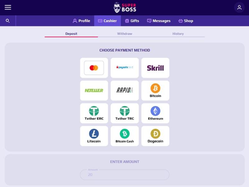 存款方式:Visa、萬事達卡、比特幣、萊特幣、以太坊、泰達幣、比特幣現金、狗狗幣、Much Better、Neteller、Neo Surf、Skrill、Cash to Code、Rapid Transfer 和 Pay Safe Card。所有存款方式應支持資金即時到帳。
