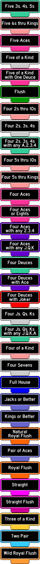 這款遊戲是Bonus Deuces Wild Poker的哥哥,除了兩張五條牌型外,賠率表完全相同。更準確地說,與其兄弟 Double Bonus Deuces Wild 相比: