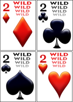 雖然所有撲克牌的背面都印有「奇才賠率」 (Wizard of Odds) 圖案,但 2(兩點)牌上還標有 WILD 符號。