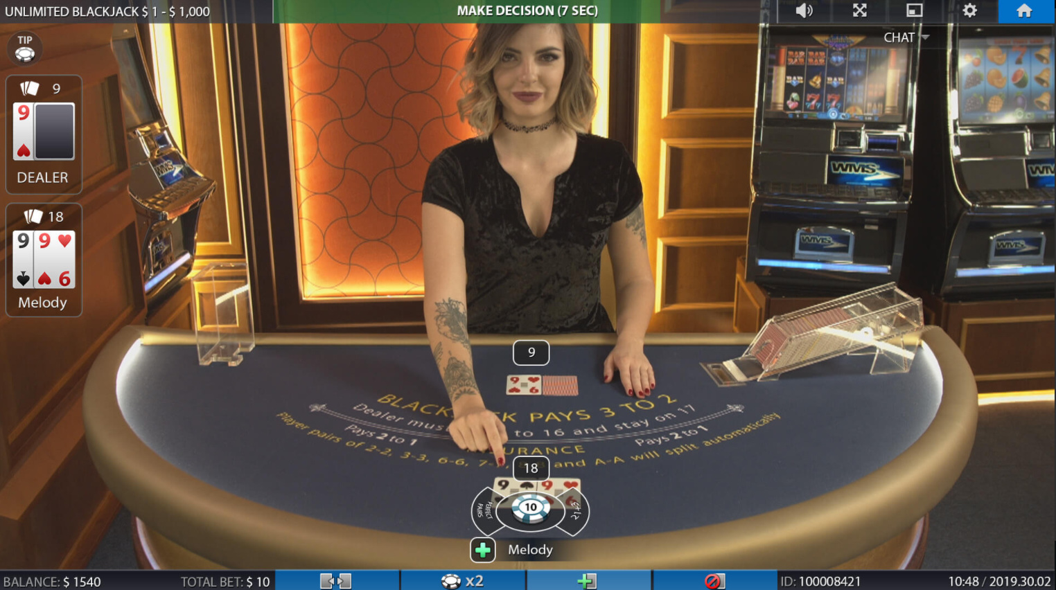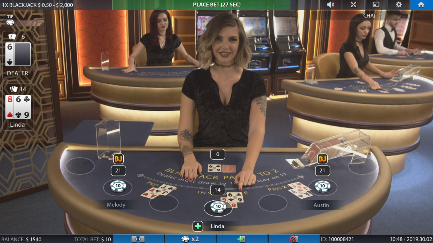 關於二十一點規則,我只能從 Mojos 網站上取得遊戲截圖。截圖顯示,莊家在軟 17 點時停牌,不拿底牌。線上真人荷官二十一點遊戲通常使用牌盒發牌,通常有八副牌。假設玩家可以在任何初始兩張牌時加倍,並且在允許分牌後加倍,則賭場優勢為 0.61%。如果不允許分牌後加倍,則賭場優勢為 0.73%。