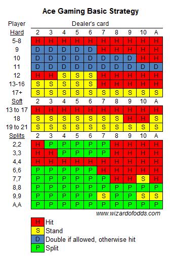 Ace Gaming 有四張二十一點賭桌。多副牌遊戲的賭場優勢相當高,達到 0.80%,對於網路賭場來說相當高。單副牌遊戲的勝率高很多。雖然單副牌遊戲的加倍點數限制在 9 到 11 點之間,但這種權衡還是值得的。單副牌遊戲的賭場優勢為 0.35%。單副牌遊戲有三個點位,多副牌遊戲有五個。