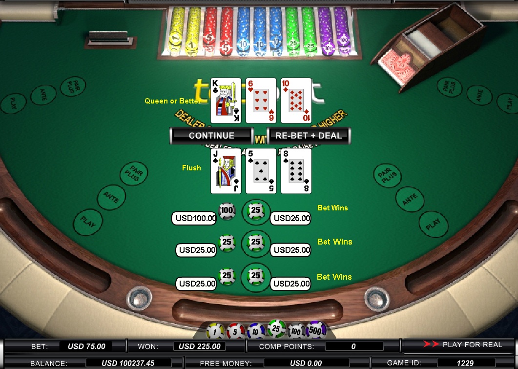 Ace Gaming 將其三張牌撲克遊戲稱為「三張牌撲克」。遊戲遵循標準的 1-4-5 Ante Bonus 賠率表,賭場優勢為 3.37%。 Pairplus 投注遵循 1-4-6-25-40 賠率表,賭場優勢為 3.49%。