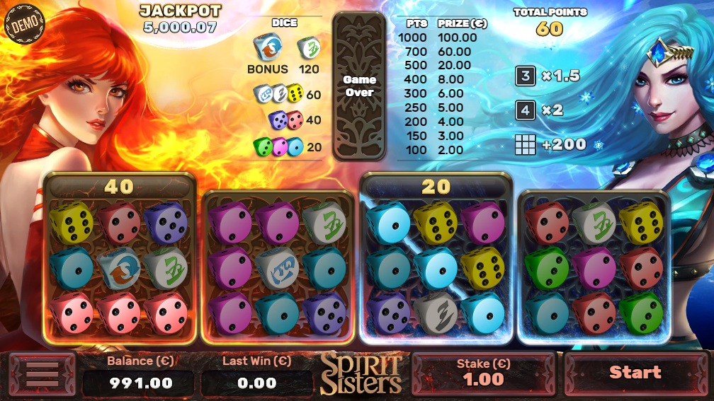 《Spirit Sisters》是一款非常獨特的遊戲。遊戲包含四個 3x3 的格子。玩家每次會獲得一疊垂直的三枚骰子。玩家可以選擇將骰子放入四個格子中的哪一個格子。骰子會放在該格子最左側的可用列中。玩家可以透過在任意行或對角線上組成三條牌來獲得積分。獲勝取決於獲得的積分數。如果在一行或對角線上組成三個獎勵符號,即可進入獎勵遊戲。