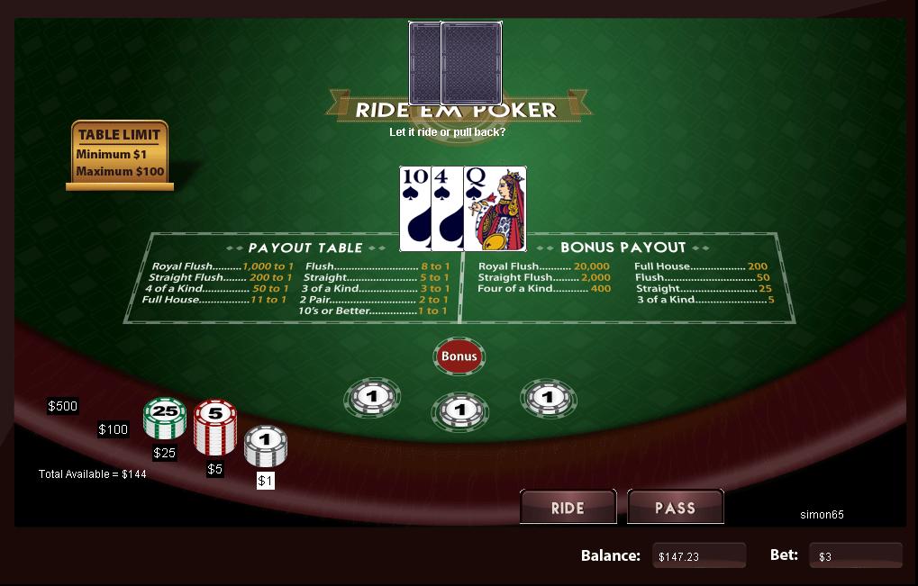 這款遊戲在遊戲選單中被稱為「Let it Ride」(至少在Drake賭場是這樣),但在實際遊戲中被稱為「Ride Em Poker」。我不太喜歡為了逃避版權費而改遊戲名,所以我還是叫它「Let it Ride」 。