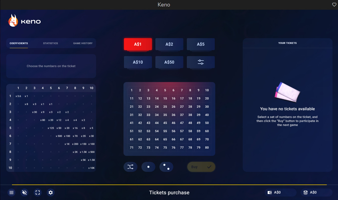Atmosfera 提供一款符合標準規則的基諾遊戲。賠率表略低,預期回報率在 82.14% 到 86.08% 之間。