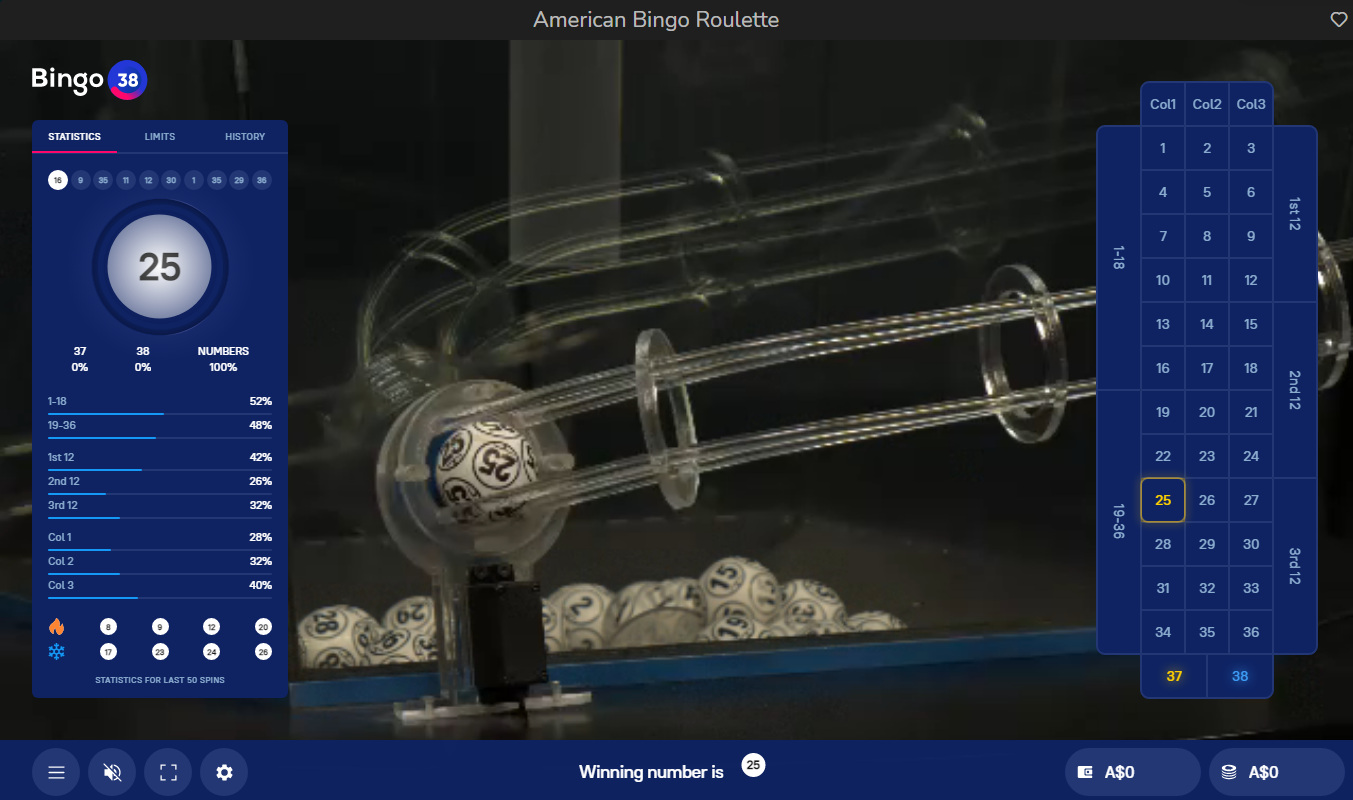 - 美式賓果輪盤賭-玩法是從38個自動球鬥中抽取一個球。賭場優勢為5.26%。
