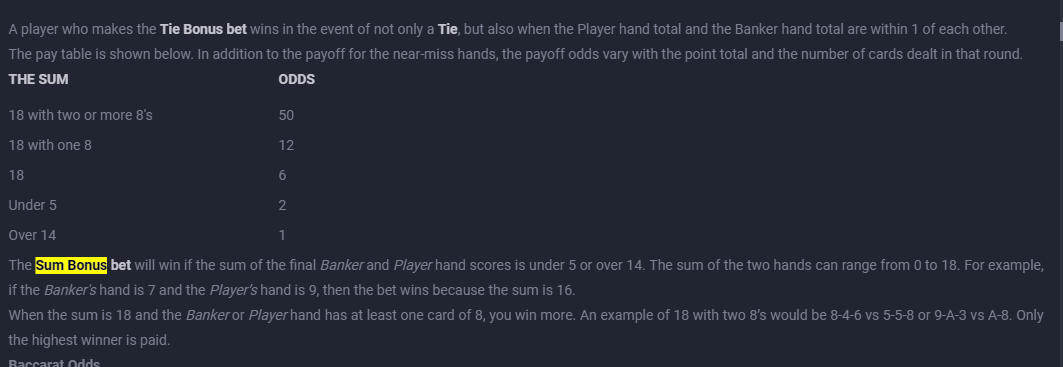 - 平手(賠率為 11 比 1):10.36%(注意:幫助文件錯誤地指出回報率為 67.23%,這意味著莊家優勢為 32.77%)。