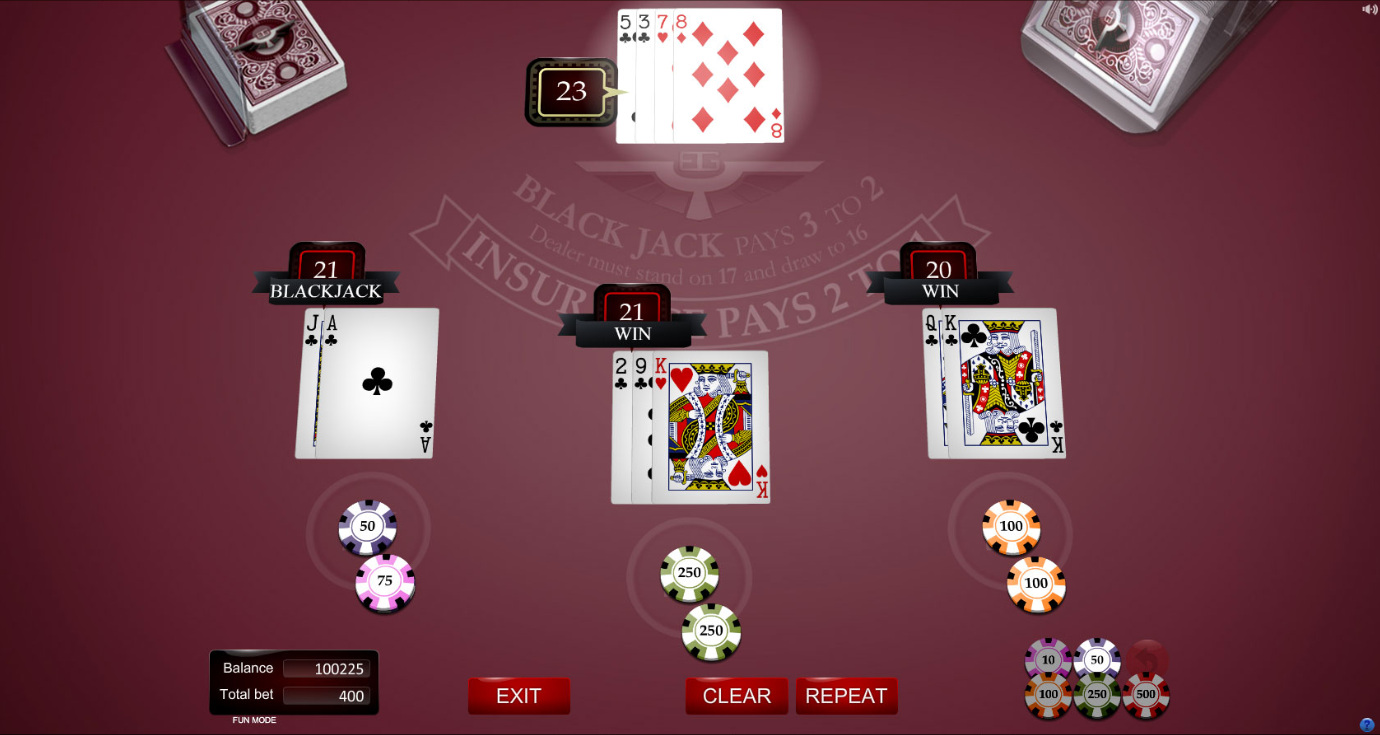 二十一點遊戲允許同時玩三手牌。規則介面顯示玩家可以重新分牌為四手牌,但我對此表示懷疑。規則中沒有明確說明牌的數量,所以我假設是八副。根據我的二十一點莊家優勢計算器,假設玩家有八副牌並重新分牌為四手牌,莊家優勢為0.43%。