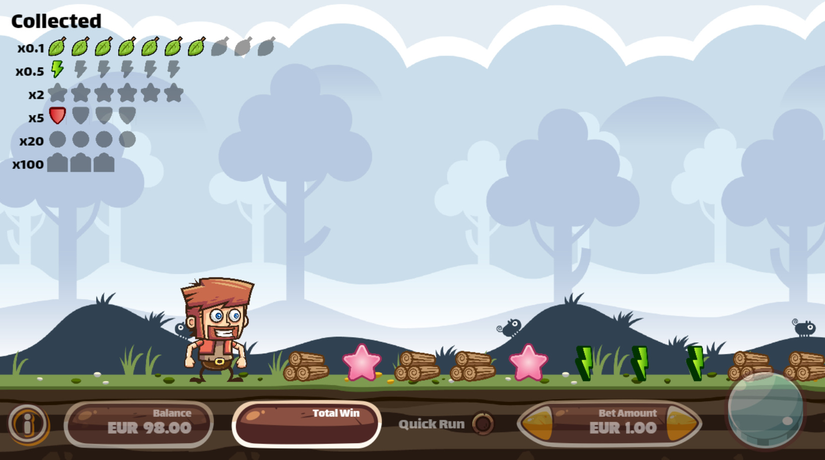 據我所知,《金幣跑酷》是一款巧妙而獨特的遊戲。它讓我想起了NES上的《超級瑪利歐兄弟》,遊戲中的角色會一路奔跑,收集他經過的任何東西。如果玩家收集到的任意指定符號數量超過規定數量,就能根據賠付表贏得獎勵。遊戲沒有提供任何關於返還的資訊。