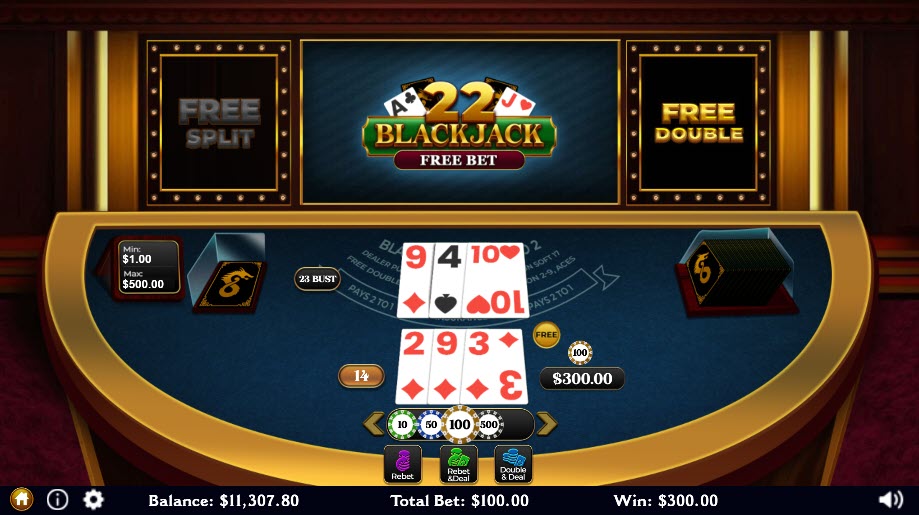 在這個遊戲中,玩家可以免費加倍(9 到 11 點)或分牌(除 10 點外的任何牌)。但問題是,如果莊家抽到 22 點,任何未完成的下注都將被視為平手。 Dragon Gaming 聲稱該遊戲的賭場優勢為 1.55%。根據標準規則,我的賭場優勢為 1.04%。更多信息,請參閱我的“免費投註二十一點”頁面。