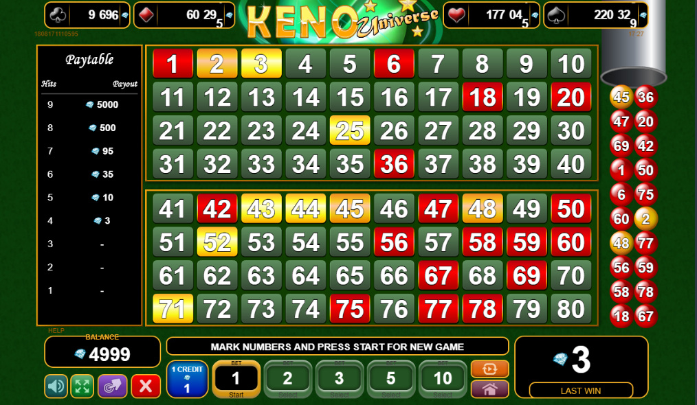 EGT基諾遊戲簡單又快速。下表顯示了賠率表和賠率。除選2外,其他賠率都在94.15%到94.48%(選5)之間。