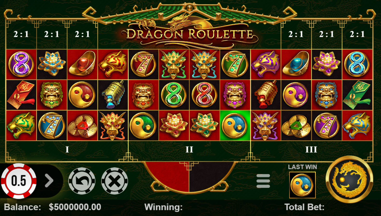 Elysium Studios 以輪盤賭為原型,打造了一款老虎機遊戲。這款遊戲的靈感來自最受歡迎的桌上遊戲之一——輪盤賭。 「龍輪盤」為玩家提供了投注符號、圖示和字元的選項,而非數字。遊戲擁有獨特的組合選項,玩家可以透過其專利的附加投注「龍注」來預測組合模式。