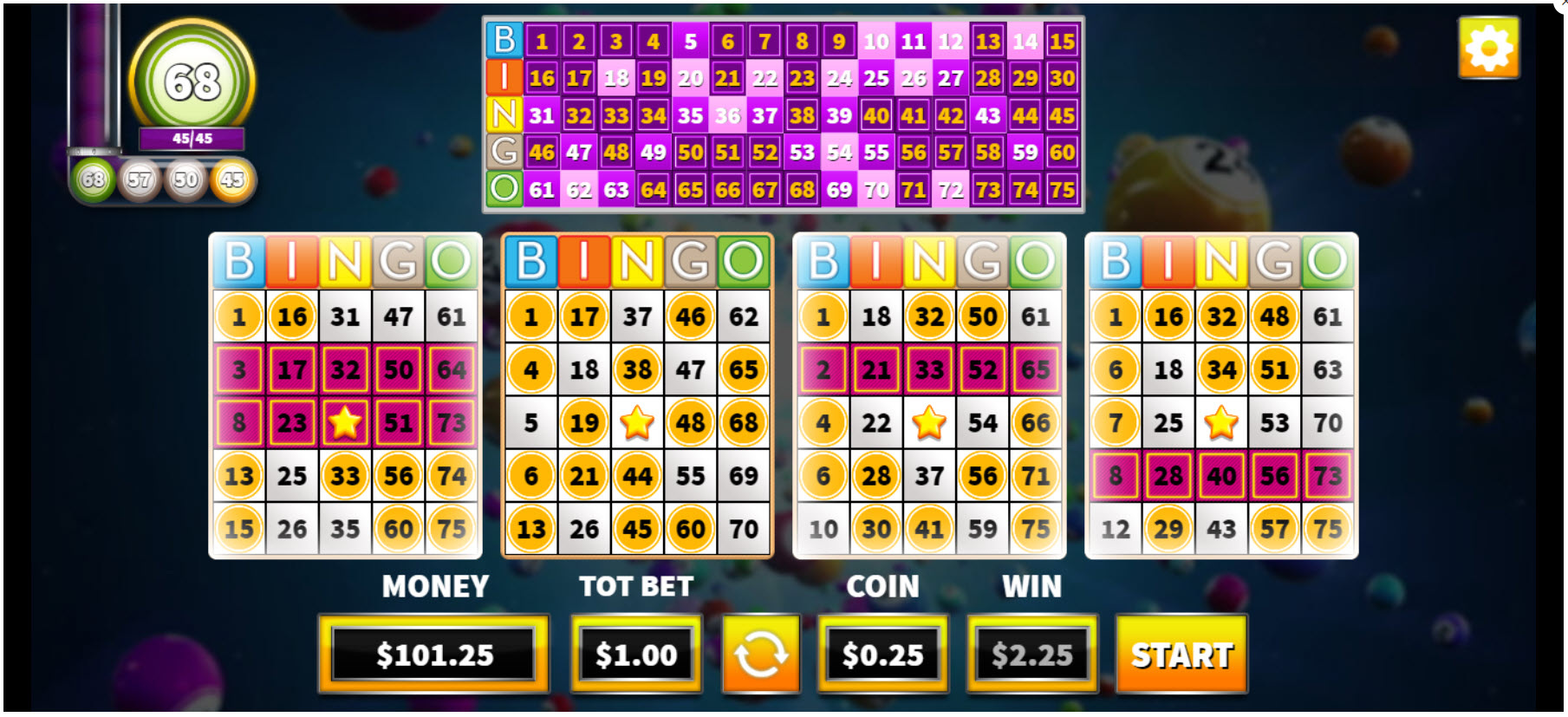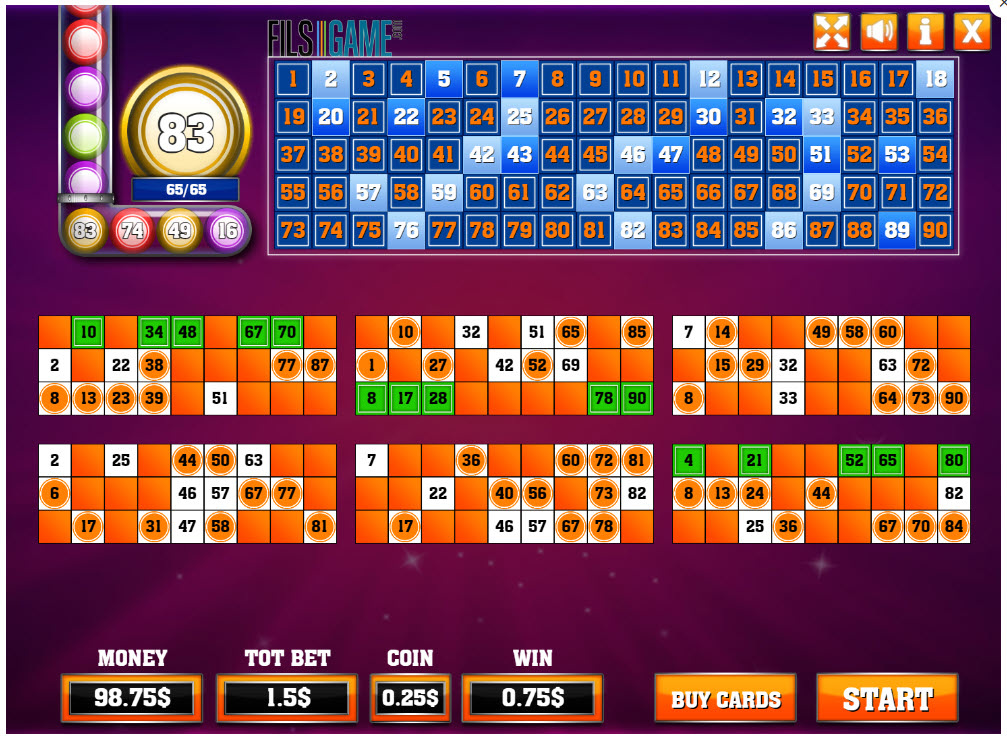 Bingo 75 使用 5x5 美式賓果卡,並帶有一個空格。玩家每次只能玩一張卡。 5x5 賓果卡的數學相當複雜,如果我沒算出它的中獎機率,請見諒。考慮到 Fils Game 的另一款賓果遊戲(90 個數字)的中獎機率很低,我懷疑這款遊戲的中獎機率也很低。