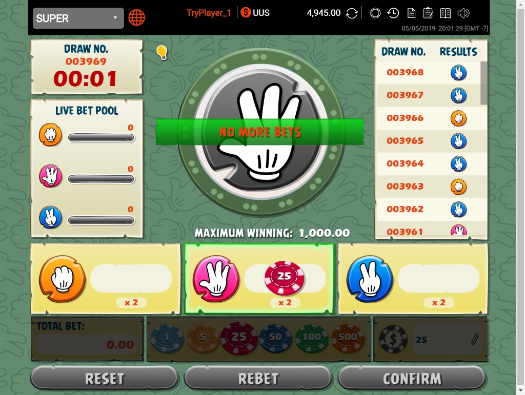 石頭剪刀布有兩種版本。經典版和超級版遵循傳統規則,但平手賠率為 0.9 比 1。幸運版和財富版使用輪盤來決定勝負,平局賠率為 0.8 比 1。不要被輪盤上那些大數字所誘惑。 105 場遊戲的樣本顯示,平均勝率僅 1.92,總回報率為 90.79%。