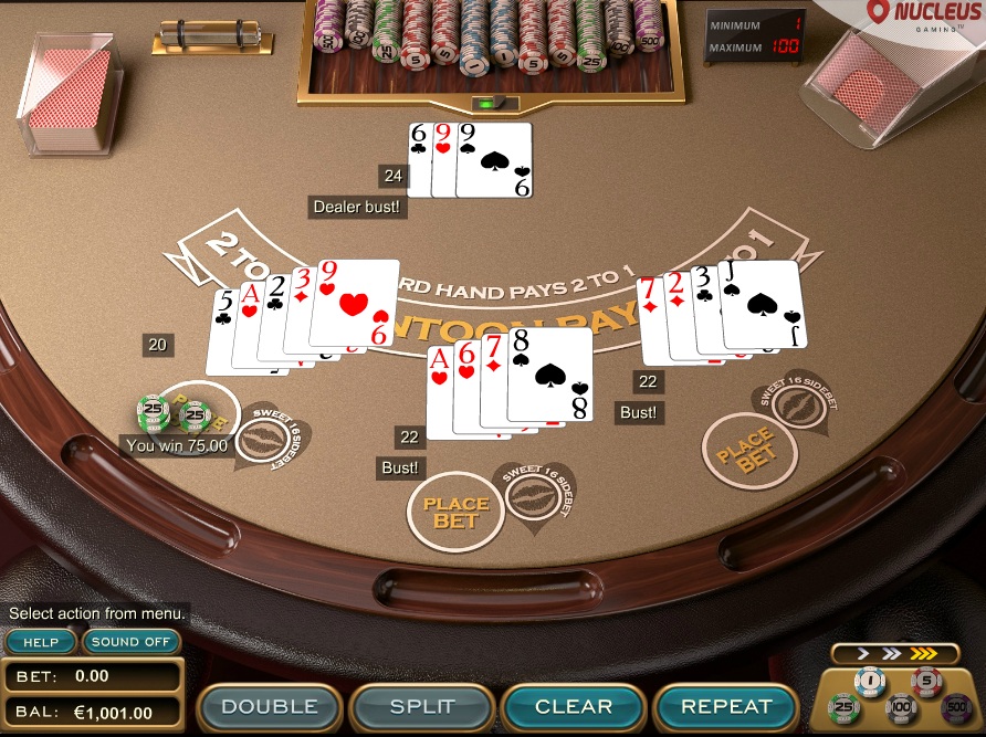 Nucleus 遵循常規規則,允許抽牌分牌 A,莊家可以拿到軟 17。遊戲使用八副牌。因此,賭場優勢為 0.38%。 Sweet 16附加註的賭場優勢為 2.52%。