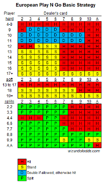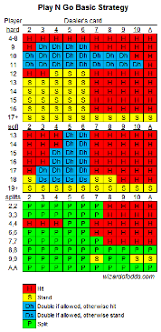 根據這些規則,賭場優勢為 1.26%。既然他們的標準遊戲賭場優勢只有 0.46%,那麼玩這個遊戲就沒什麼意義了。不過,如果您一定要玩,請點擊下方圖片,查看這些規則下基本策略的放大版本。請注意,由於規則非常規,所以這也是一種非常規策略。
