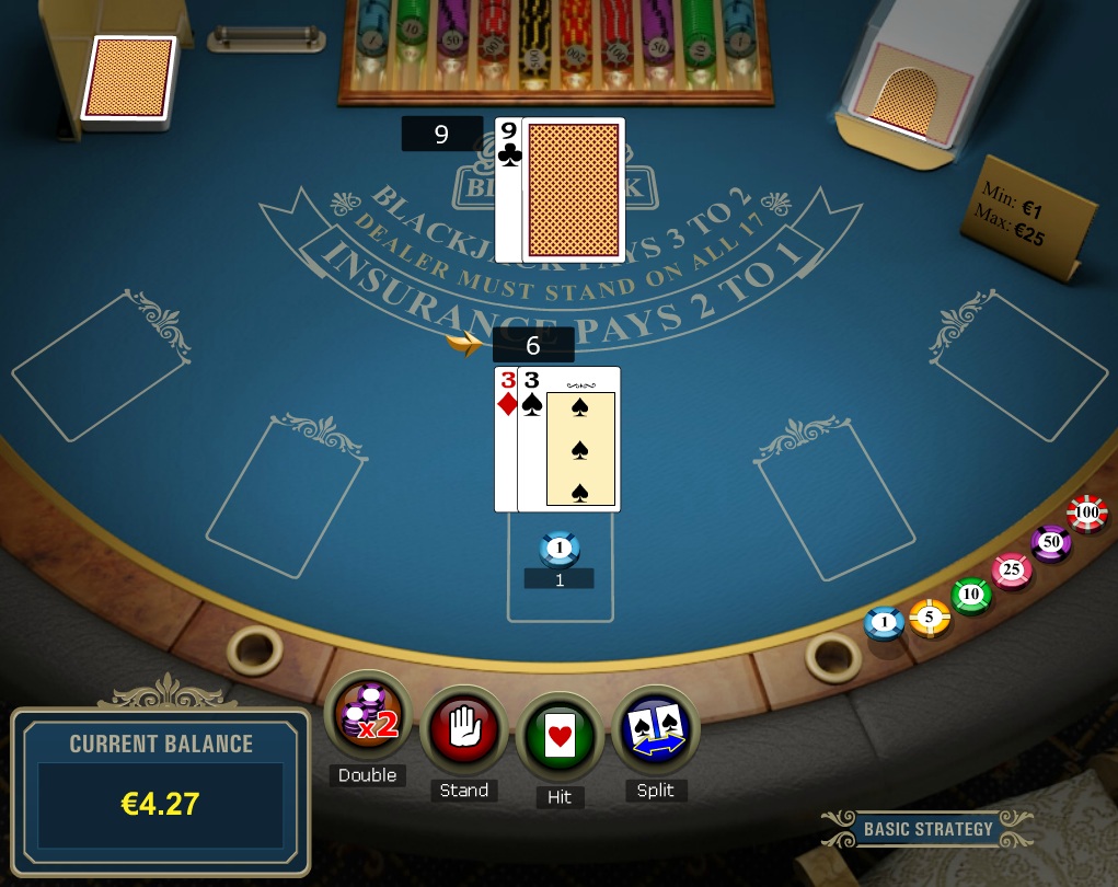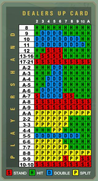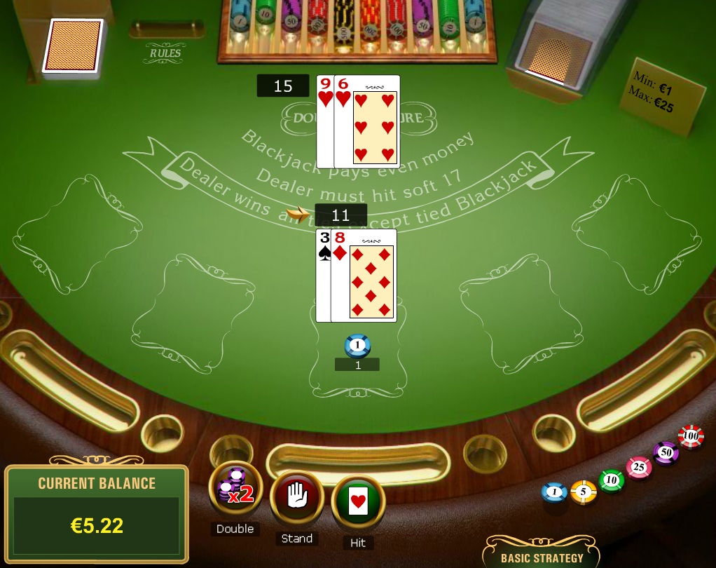 我知道兩種二十一點遊戲──皇家二十一點和多手二十一點。可惜的是,我到處都找不到它們的規則。不過,根據我玩了一手牌(我玩的帳號只剩下幾美元)的牌桌經驗和基本策略圖,我至少可以推斷出以下幾點: