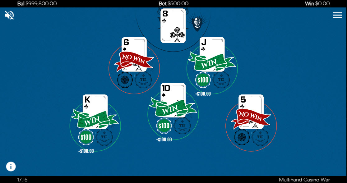 PureRNG 將他們的遊戲命名為「賭場戰爭」(Casino War),即多手牌賭場戰爭。玩家可以同時玩最多五手牌,對抗一張莊家牌。他們遵循我所說的“自由版本”,即在平局後加註的賠率為 2 比 1。平手下注的賠率通常為 10 比 1。