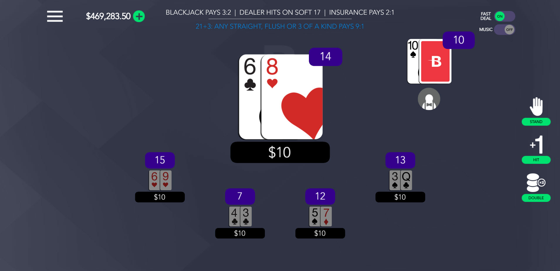 PureRNG 提供兩款二十一點遊戲——多手牌和單副牌。多手牌遊戲每次可玩一至五手牌,並使用八副牌。單副牌遊戲每次可玩三手牌。